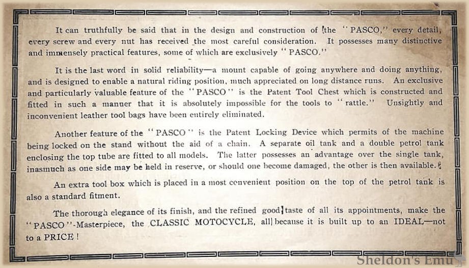 The thorough elegance of its finish, and the refined good taste of all its appointments, make the "PASCO" - Masterpiece, the CLASSIC MOTOCYCLE, all because it is built up to an IDEAL - not to a PRICE!