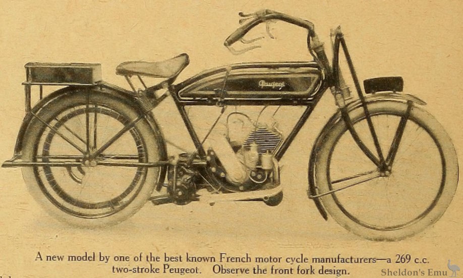 A new model by one of the best known French motor cycle manufacturers - a 269 c.c. two-stroke Peugeot. Observe the front fork design.