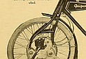 Cyclomoto The other Peugeot model is the Cyclomoto, the engine of which is in the front wheel. Like the larger model, it is a two-stroke, 45x58 mm. (92 c.c), and is entirely self-contained with its drive. A magneto flywheel is fitted, which serves for both ignition and lighting, and the unit incorporates a Ferodo-lined disc clutch. The engine lies in the centre of the front hub, the inner side of which has an internally-toothed ring, and there are meshing with it three pinions, one of which is driven by the engine. All working parts are entirely enclosed, and the lubrication is by the petroil system. The front wheel and forks, which are of the spring variety, may be supplied with an attachment for fitting to an ordinary pedal cycle. It is said to be capable of averaging 18 m.p.h.