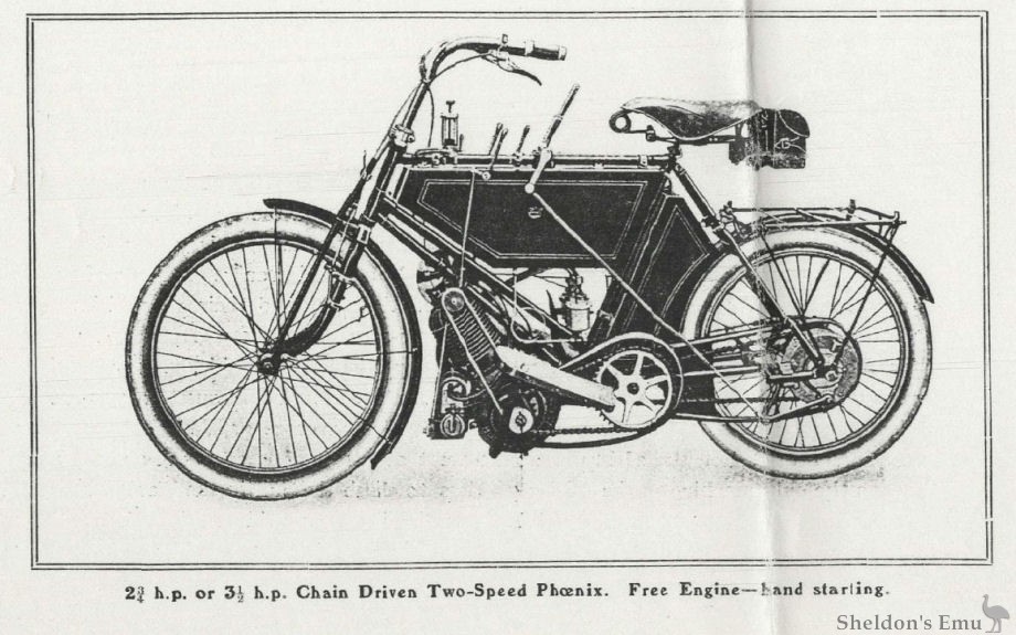 TRANSMISSION. Chain driven, by Hans Renold's motor chain, through countershaft. Separate adjustment to each chain.