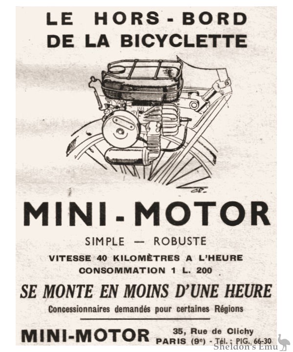 The Mini-Motor clip-on engine was marketed in the UK in 1949 and later as the Trojan Mini-Motor, and the engines may have been built there under licence.