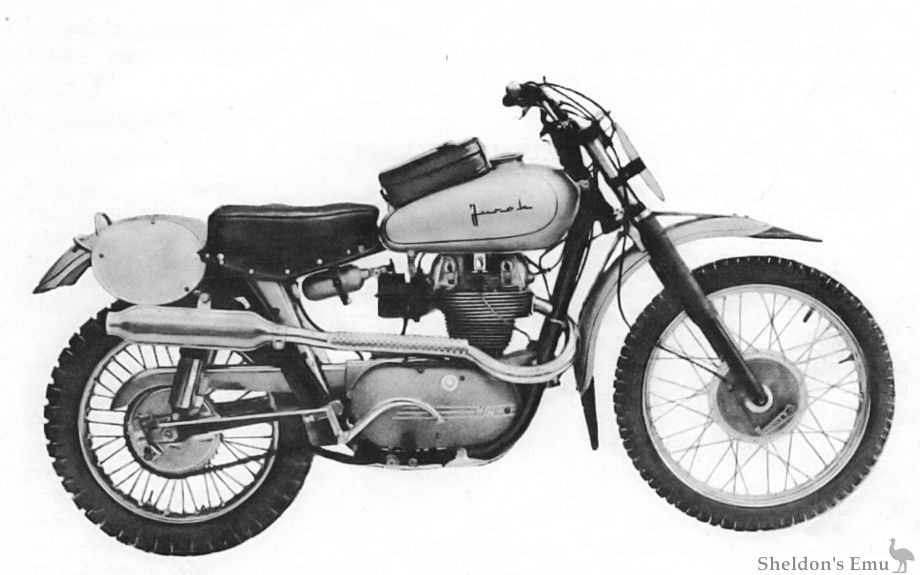 Front and rear suspensions are very orthodox, and like everything else on the machine, have enough sheer mass to inspire confidence. Plenty of wheel travel has been provided and the only reservation we have is that the dust covers on the front forks are the same silly and inadequate leatherette "chaps" that mar the otherwise excellent Jawa. Tightly-clamped rubber boots are much better and will, no doubt, be installed by anyone buying a Junak. The front forks do have one little touch that is rather interesting: the axle is not clamped at the bottom of each fork leg, as is the custom; instead, it slips through an eye on one side, and screws into a threaded bore in the opposite fork leg. When the assembly is pulled up tight, the threaded fork leg is virtually locked to the brake backing plate, and the entire hub assembly is forced to act as a brace for the bottom of the forks. The seating and control layout on the Junak would be really unbeatable but for one small defect: the bike is so tall that a rider with short legs will find difficult, if not impossible, to get both feet on the ground once he is astride. This is only a slight exaggeration; the Junak rider is so tall in the saddle that it is a bit ridiculous. If he ever leans well over to take a turn briskly, the change in altitude should be enough to make his ears crack. Part of this extreme height is due to adding very large-diameter wheels for dirt riding; part to the bulky engine; and partly just because no real effort has been made to make the machine more compact (we understand that sheer size is quite highly regarded in East Europe). For whatever reasons, the seat is away up there, and any rider standing less than six-feet in his bare tootsies (and having a lot of that height allotted to leg) is going to spend his standstill time on tip-toe.