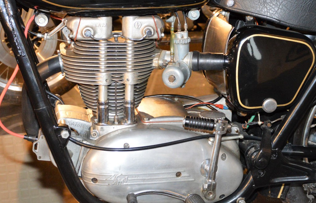 Sound signal sp56 located in the housing of the reflector. In the drivetrain it got a new clutch and a full chain guard. Front wheel travel increased to 150 mm, rear wheel travel to 100 mm. The brakes are mechanically actuated, independent front and rear drum brakes, with full-width hubs. Light alloy cast brake drums with cast iron insert. Internal diameter of brake drums 200 mm, brake lining width 40 mm. Hand brake and foot brake controlled by Bowden cables.