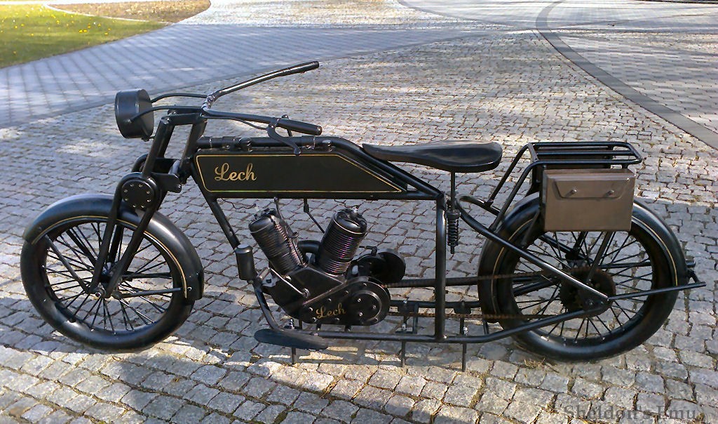 The manufacturer "Lech" existed from 1 January 1929 (created by industrialist Waclaw Sawicki and engineer Wladyslaw Zalewski - re-emigrant from the United States - constructor of the vehicles) to 1932. First bikes were presented on General National Exhibition in Poznan. The bike was not big but reliable, equipped with a four stroke, V-twin, 5 hp engine. Pipe frame went over and under fuel tank (10l of petrol, 2l of oil). Both brakes (hand and leg) worked on rear wheel. It was drum brake: inner shoe brake and outer band brake. Gear box was separate and was driven by chain transmission. The engine was very modern, with light light alloy pistons, removable cylinder heads, pressure lubrication and roller bearings on the conrod little-ends.