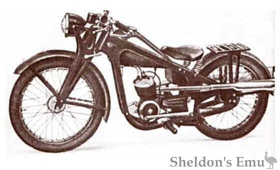 A chrome-plated fuel tank (20:1 petrol-oil mixture) with a capacity of 8.5 litres was fitted; this amount was sufficient to complete a 300-kilometre journey without refuelling. Some versions had a saddle tank with slightly larger capacity. The motorcycle had a single-cylinder two-stroke engine coupled with a gearbox, and the piston and cylinder head (equipped with decompressor) were made of light alloys. The molybdenum cast iron cylinder had, in later models, a dual-port exhaust and the crankshaft was fitted with ball bearings. The gearbox was foot-operated, quite rare on motorcycles of this class at that time. It had only two gears, and this was given as an advantage in the manufacturer's advertising catalog.