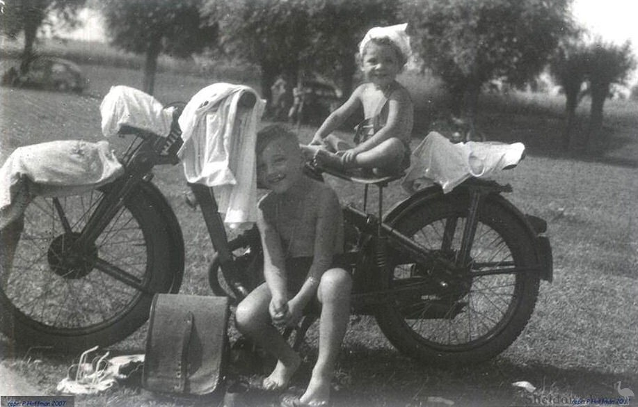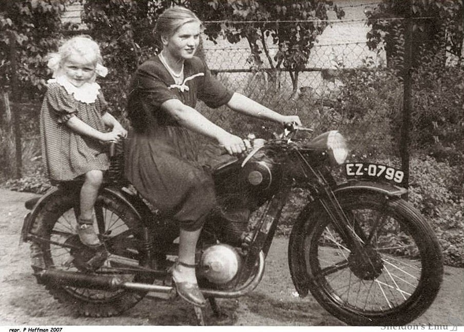 Engine - Type SOI, spark ignition two-stroke, backwash rigidly mounted in the frame of the motorcycle Cylinder diameter 52 mm, piston stroke 58 mm Number of cylinders l. Displacement 123 cc, compression ratio 6. Maximum power 3.0 kW (4.0 hp) at 4250 rpm. The maximum torque of 7.36 Nm (0.75 kGm) at 3000 rpm. The engine block, cast in light alloy, divided in a vertical plane, was also the housing of the clutch, gearbox and magneto. Ribbed cast iron cylinder. Ribbed light alloy head. Crankshaft forged, folded, supported on four ball bearings. Forged connecting rod, roller bearing in the foot. Light alloy cast piston with a slightly convex crown and two sealing rings. Piston pin embedded floating. Piston timing. Control of the charge flow through the edges of the piston. Two through channels. Mixed lubrication, fuel-oil ratio 20 : l. Forced air cooling. Power supply: horizontal carburetor, Amal E68/16 with a throat diameter of 16 mm, mounted directly on the cylinder. Flat air filter, made of metal mesh, mounted on the carburetor. Starting shutter on the air filter. Dry weight of engine with accessories and gearbox approx. 20 kg.