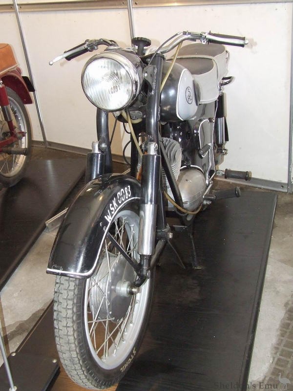 Engine - Type S32, spark ignition, two-stroke, with backwash, rigidly mounted in the motorcycle frame. Bore 61.5 mm, stroke 58 mm. Number of cylinders l. Engine displacement 0.173 litre. Compression ratio 6.9. Maximum power 6.6 kW (9 hp) at 4800 rpm. Maximum torque 14.7 Nm (1.5 kGm) at 3500 rpm. Light alloy cast crankcase, vertically split. Ribbed cast iron cylinder. Ribbed head made of light alloy casting. Crankshaft forged, folded, supported on four ball bearings. Lubrication of the engine with a mixture of fuel and oil in the ratio of 25 : l. Air cooling without force.