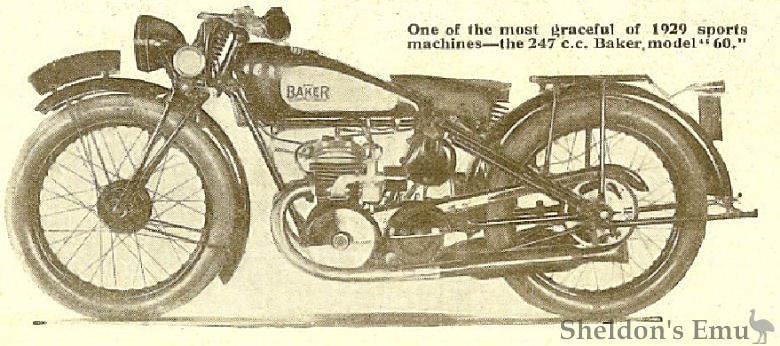 BAKER machines for next year will be available in five forms for road use, and in addition there will be a special model built primarily for grass-track racing. From the point of view of appearance alone, the new models represent a distinct advance on the 1928 productions. The " Colonial " frame, with its high ground clearance, is standardized now for all models, and saddle tanks, shapely in outline and neatly finished with a yellow panel on a black ground, are employed on ail hut one design.