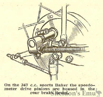 An extremely neat drive for the speedometer is arranged from the rear wheel, the large fibre gear ring being secured inside the brake drum, while the driven shaft communicating with the cable, and carrying the small gear wheel, is attached to the anchor plate.