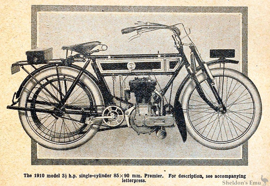 — Premier motor cycles have gained much deserved popularity during 1909 by reason of their sound design and various successes achieved in competitions. The 3½ h.p. single-cylinder model possesses no novel features, but is substantially constructed on well-tried lines, its specification including chain-driven magneto. Brown and Barlow carburetter, and spring forks. The engine fitted to the 1910 model is a new one of the Premier Co.'s own make, and fitted with ball bearings to the crankshaft and mechanically-operated inlet valve. It is of moderately high compression, and measures 85 by 90 mm. Numerous radiators are cast vertically on the combustion head, permitting a free passage of air which assists in keeping the engine cool. The frame is designed so that the cylinder can be removed without disturbing the crankcase, which is a great point. The design enables a most comfortable riding position by the aid of footrests, and refinements include a large mud flap to screen the magneto, petrol gauge, stand and tubular luggage carrier, and a serviceable tool-roll. The spring forks enable the use of a front rim brake, the second brake being of the ordinary foot-applied belt rim type.