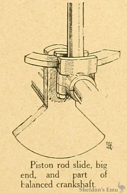 On the piston descending, the induced gas is compressed in a cast aluminium receiver bolted to the cylinder, and thence is transferred to the combustion space via the cylinder head and baffle plate. The piston head is stepped on both sides of the baffle, the steps being arranged so as to make full use of the rotary movement of the piston. At the back of the balanced crankshaft lies a plunger pump, which forces oil from a sump in the crank case through the crankshaft to the big ends and piston rod slides, the oil passing through the centre of the pump plunger into the crankshaft. The guides and pistons are amply lubricated by splash, as the suction below the piston helps to raise the oil. Ball bearings carry the crankshaft at each end.