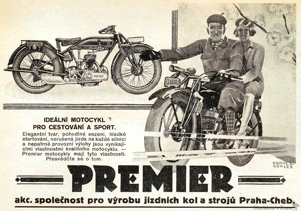 The company moved to Eger (now Cheb) shortly before the onset of the first war and over the following decade produced mainly bicycles and perambulators. After the demise of the English parent company, Premier CZ developed their own models fitted with JAP and Python engines from Rudge-Whitworth. During the 1920s the Czech factory, managed by Englishman Geoffrey Rotherham, became the largest producer of motorcycles in the country.