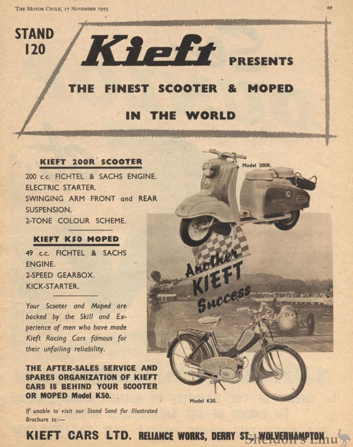In 1957 Kieft added two more scooters to the product range, powered by a 147cc and 197cc Villiers engines, and later a 200cc Sachs-powered scooter. It is thought that only a few of the later models were produced.