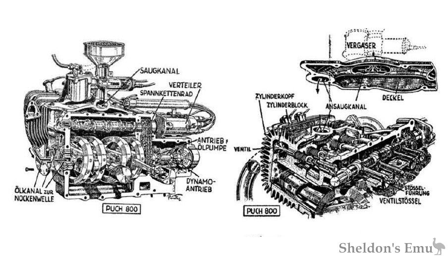 An inverted carburetor, specially designed by Puch (which in 1937 was replaced by a Solex IFP CV), was mounted on the valve cover which had integral short inductin tracts which fed both sides of the engine. Advanced design of both the combustion chamber and the valve train and with the use of a downdraft carburetor achieved high performance and excellent acceleration along with very good fuel economy - 4.5 Lt / 100 km, and 6.5 Lt / 100 km with sidecar.
