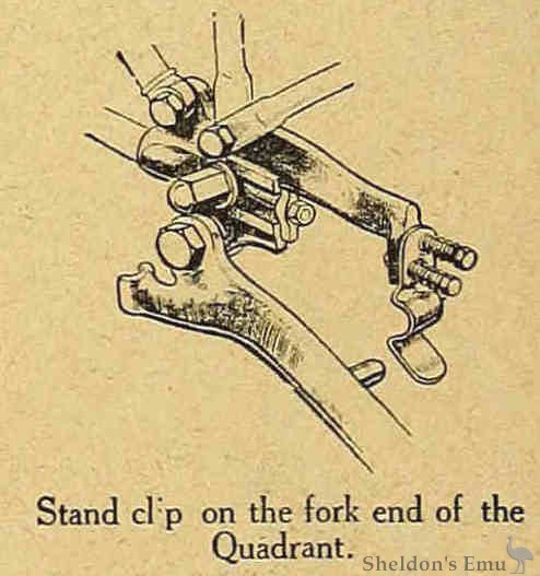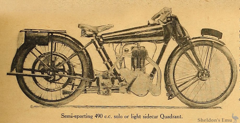 Quadrant spring forks, a front internal-expanding brake, and a saddle tank are items on this model, as on the majority of the other machines.