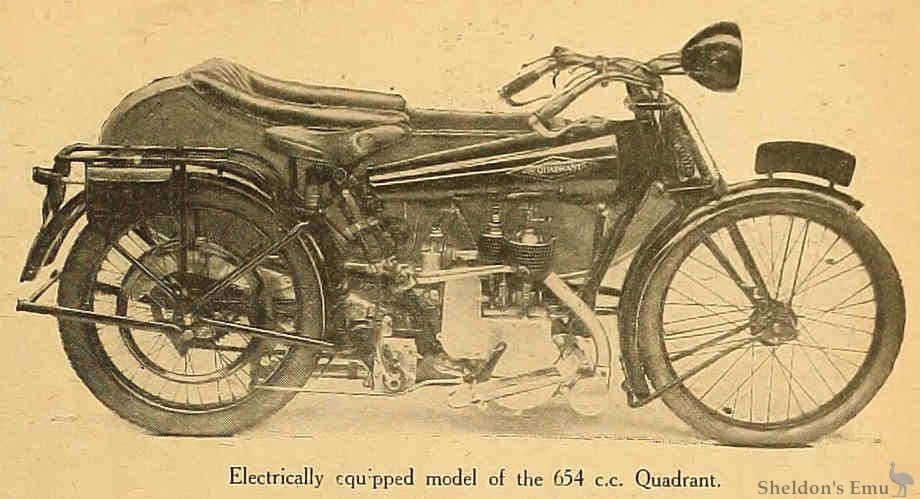 Always one of the most moderately priced big singles, the 654 c.c. chain-driven Quadrant still retains a position in this respect that requires some surpassing. It has a sturdy, straightforward engine noted for its slogging capabilities and distinguished by the unusual position of the inlet valve behind the cylinder.