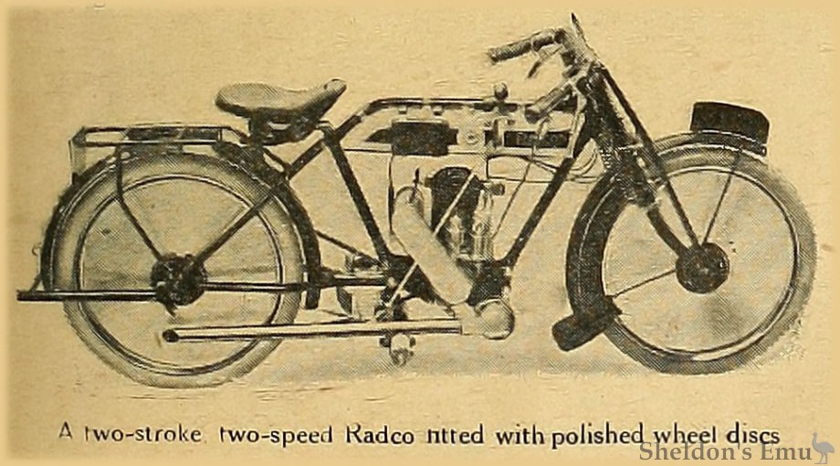 Sporting lines are followed on this Radco 2½ h.p. model, which is equipped with disc wheels, knee pads, and rubber grips at an inclusive price. A low-priced two-stroke machine, the 2¼ h.p. Radco No. 2, sold with fixed gear at forty-two guineas.