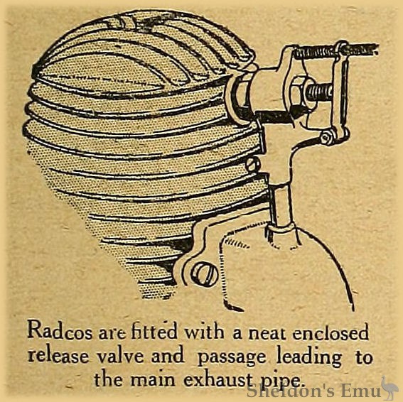 On the new Radco sporting model all non-essential parts have been eliminated, yet there is everything that could assist the rider to attain the required end. Footrests, naturally, have superseded foot plates in this type; the engine is standard, as also the transmission,, but the equipment includes knee grips; the bars are dripped and aluminium discs give a distinctive air to the 24in. wheels. A long pipe conducts the exhaust gases well away from the aluminium silencer, and this pipe is substantially stayed fore and aft to prevent rattle. An improvement this year, in addition to the enlarged engine, is that the decompressor discharges into the main silencer pipe instead of into the atmosphere. It is possible to drop the engine from the frame when three bolts have been withdrawn and the engine controls disconnected. The touring models range from a simple single gear mount to a machine equipped with two-speed clutch and kick starter, and a Maglita lighting and ignition set arranged in lieu of the magneto. A Flexa saddle suspension pillar is fitted to one of the standard models.
