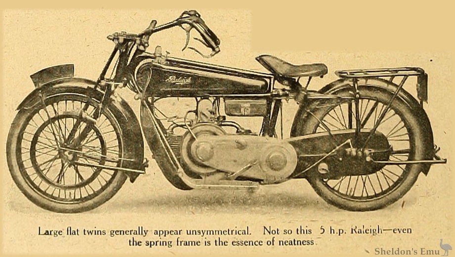 Large flat twins generally appear unsymmetrical. Not so this 5 h.p. Raleigh - even the spring frame is the essence of neatness.