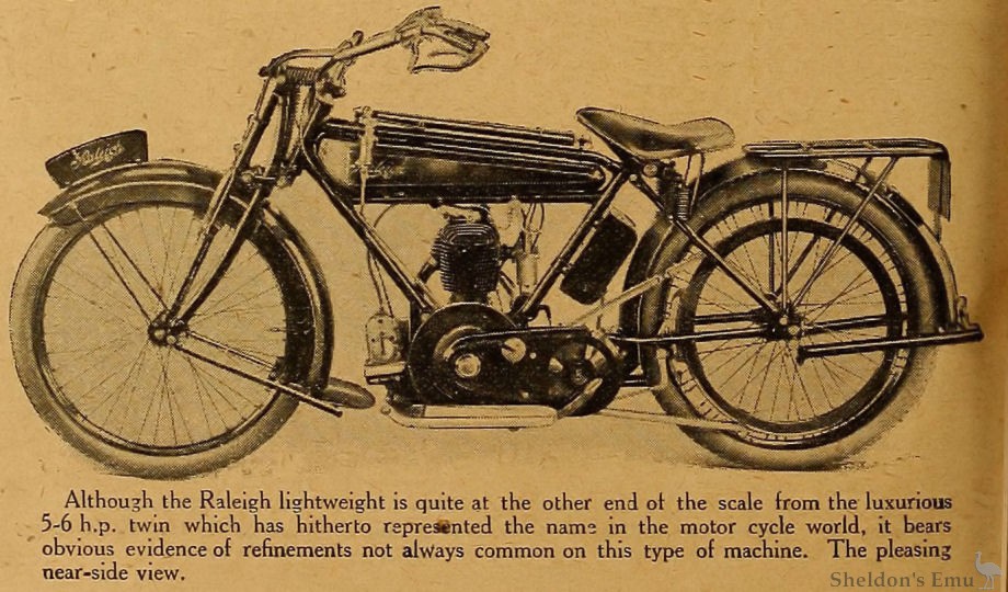 Although the Raleigh lightweight is quite at the other end ot the scale from the luxurious 5-6 h.p. twin which has hitherto represented the name in the motor cycle world, it bears obvious evidence of refinements not always common on this type of machine. The pleasing near-side view.