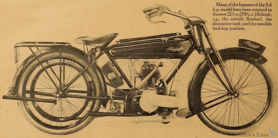 Many of the features of the 5-6 h.p. model have been retained in the new 2¾ h.p.(350 c.c.) Raleigh, e.g., the outside flywheel, the distinctive tank, and the sensible, tool-bag position.