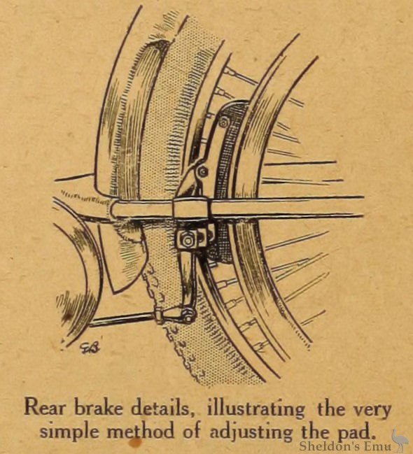 Rear brake details, illustrating the very simple method of adjusting the pad.