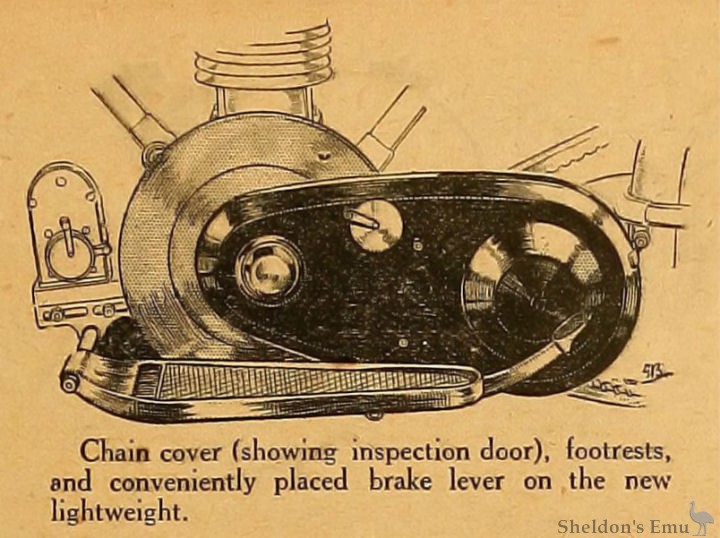 Standard models will be equipped with the Sturmey-Archer two-speed gear with clutch and kick-starter and chain and belt drive. The primary chain is of ½ in. pitch x ¼in. width, and is enclosed, as beforehand. As an extra, a new type of Sturmey three-speed gear box may be had in lieu of the two-speeder. One point making for neatness is the mounting of the gear lever bracket on an extension of the off side engine plate instead of clipping it to the saddle tube, as is usually done. The final drive belt is 7/8 in.