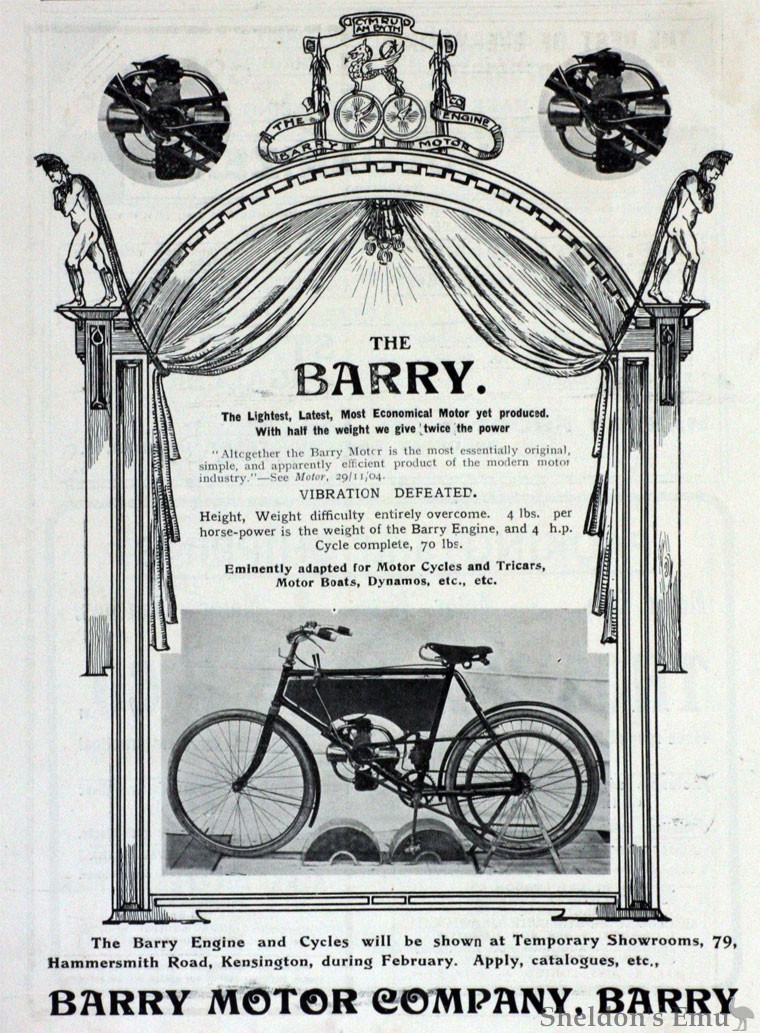First seen at the Stanley show of 1904, the machine was unusual in that it had a 200cc flat-twin-cylinder rotary engine that turned on a fixed crankshaft. Designed by Redrup (who hailed from nearby Barry), it was fed by a gas storage reservoir that balanced the silencer. The engine rotated between twin downtube sections of the frame and was enclosed in an aluminium case that had cooling air holes.