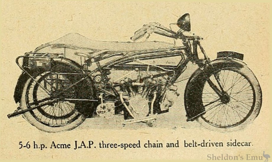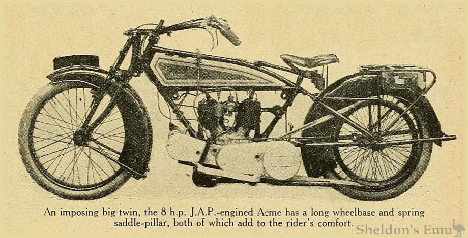 Designed for use with a sidecar, the Acme is fitted with an 8 h.p. J. A. P. engine, Sturmey-Archer gear box, and chain and belt transmission. The sidecar lugs are built integral with the frame, and the steering head and lugs are steel stampings. Lubrication is carried out by suction through a sight feed lubricator, which is supplemented by a hand pump carried on the off side of the tank in a position convenient to the driver's hand. Brampton spring forks are fitted as standard, and wide mudguards with deep valances give ample protection to the driver and machine. The tank is of large capacity, accommodating 2 1/3 gallons of fuel and 3 1/3 pints of oil, so that on tour there is no necessity to be constantly filling up.