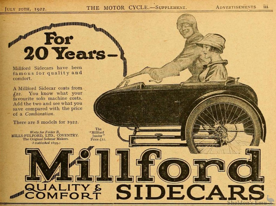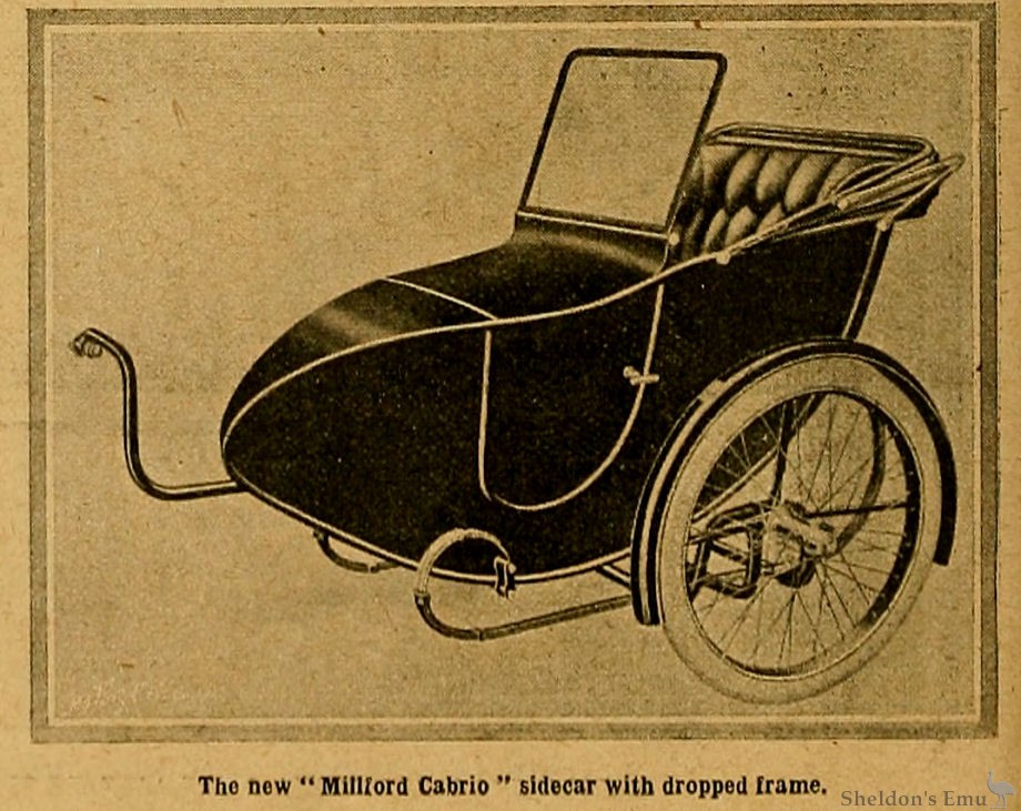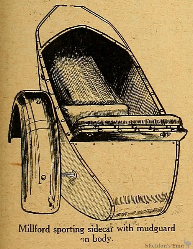Several improvements have been effected in the Millford range of sidecars, the outstanding alterations being chiefly in the big family model. Last year this double-seater was roomy, but the addition of a good-sized bulbous back adds considerably to its effectiveness as a touring sidecar. The greater height, too, of the front back-rest is a decided improvement, and the well for the feet of the rear passenger is a minor alteration that will be acceptable to tall passengers., The important question of price has been studied closely by the makers, and reductions of from £3 to £9 5s. have been effected.