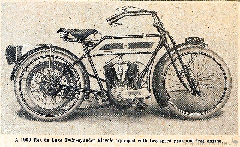 A 1909 Rex de Luxe Twin-cylinder Bicycle equipped with two-speed gear and free engine.