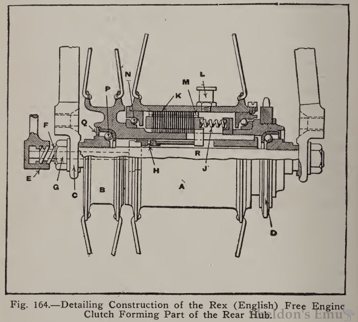 An example of a free engine clutch of the multiple disc type installed in the rear hub is shown at Fig. 164. This hub is used on Rex motorcycles which are of English manufacture. The driving member forms an inner hub that is independent of the outer hub shell except for the driving connection that exists when the discs are pressed together. The flanged driving member B is attached to the driving pulley by suitable spokes and revolves on ball bearings P. The outer hub shell, which carries one set of discs is mounted on bearings N. When the clutch assembly K is pressed together by the springs J, the main hub A and the driving member B are securely locked together and ball bearings N do not revolve. When the internally threaded member E is moved on the externally threaded member or worm F, it exerts pressure against the transfer rod G passing through one end of the axle R and pushes against a ball thrust bearing H which compresses the springs J by moving the pressure plate away from the disc assembly. When the discs are free, outer hub A can turn on ball bearings N independently of the member B, which continues to revolve as long as the engine is in motion.