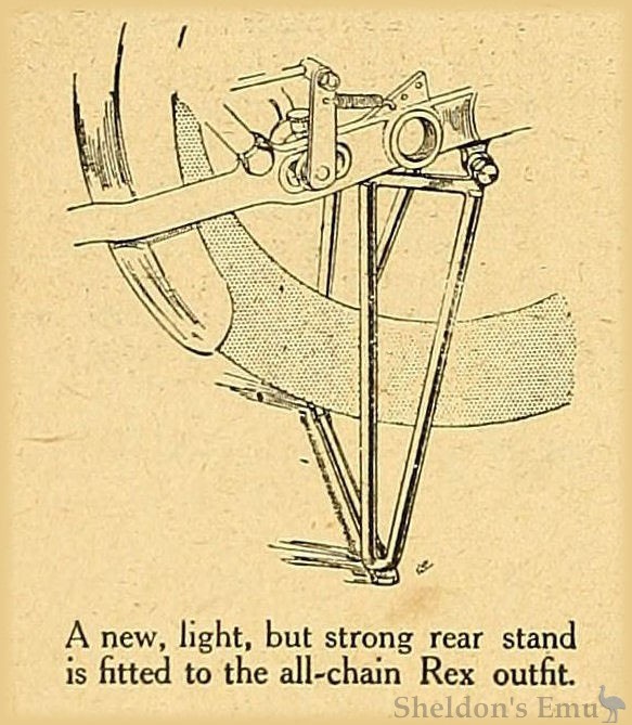 In the model 44 C Rex is presented a dual-purpose mount of attractive appearance. With a view to its employment with a sidecar, the lugs for attachment are built into the frame, which is specially designed to give a low saddle position. The large diameter and length of the steering head is a good feature, which should be noted. Brampton spring forks are adopted as standard; and particularly good features are the strong construction of the hubs and the large size of the lubricators. Each hexagon screwed plug is plainly marked "fill with grease," so that the novice need be under no misapprehension as to the method of lubrication. Similar to this model is a lighter machine known as the model 44 L, the same engine and transmission being employed, but 26in. wheels are fitted, shod with 2½ in. tyres. The tank on this model is not quite so large.