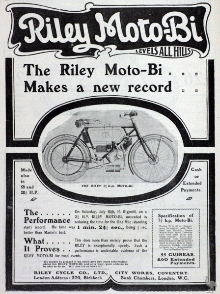 1903 During the year a further option was added in the form of a 3½ hp MMC engine. The solos were advertised as the Moto-Bi. Late that year, Riley started fitting their own engines in the vertical mounting position, but still kept the Moto-Bi name. Engine sizes were 2.25-hp, 3-hp and 3.5-hp. The largest of those was intended for forecar use, with the option of water- or fan-cooling, and both forecars and sidecars were included in the range.