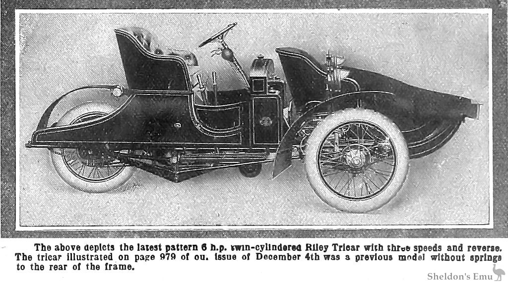 Another special feature is that the engine fitted will be made expressly for the company by the Riley Engine Company, Coventry, embodying narrow crank case in conjunction with bearings of great width, valves of substantial proportions, mechanically-operated on a system recently patented by the Riley Engine Company. The fittings comprise a Longuemare carburetter, two P and R. accumulators with unspillable electrolyte, Bassee-Michel trembler coil. The Riley Moto Bi will he made in the following sizes:- 2.25 h.p. and 3.5 h.p., this latter is specially designed for fore-car, etc., use, and which may be had with either fan or water cooling. Prices range from 42 guineas.