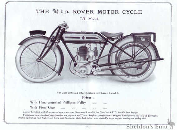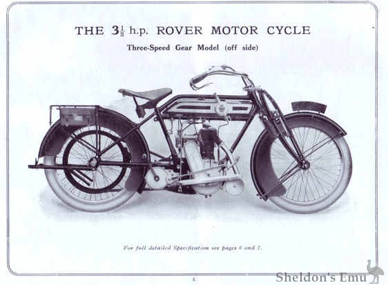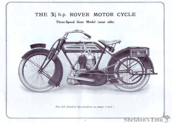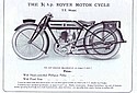 At this stand the Rover Company, who were among the earliest to manufacture a successful motor-bicycle, will be showing a new model. It is a 3 1/2 H.P. with Rover engine of 85 bore by 88 mm. stroke. The inlet valves are mechanical, the transmission is by 4in. belt, on two gears, the high ratio being 44 to 1 and the low 64 to 1. Spring front forks are fitted, while the diameter of both wheels (which have 24 Dunlop tyres) is 26in. The height of the saddle from the ground is 32in., and clearance is 4in. The machine has a wheelbase of 56in., and a weight of about 1801bs. Pedalling gear stand and carrier are provided, and a Triumph free engine clutch, made under license from the Triumph Co., is included in the price of £55 net.