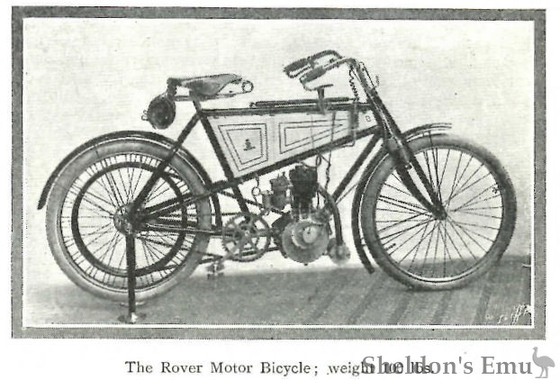 One of the Rover motor bicycles weighs about 100 lbs., all ready for the road. A small air-cooled engine is fitted. The drive is taken by a belt from the engine pulley to the back wheel pulley, which is built in with the main wheel rim by means of substantial spokes. A front wheel rim brake operated by a right-hand lever and back-pedaling brake on to the rear hub brake drum are fitted. This machine can be wheeled backwards without bringing the brake into play. The engine is built into the frame, in a vertical position, the down tube carrying at its lower end a lug on to which triangular-shaped side plates clip the crank case, and at the rear part of the crank case a projecting tube from the bottom bracket lug also carries side plates which clip to the engine crank case. A through tube passes from the bottom steering socket to the side tube, and away to the rear hub spindle by duplex chain stays, thus making a rigid construction throughout.