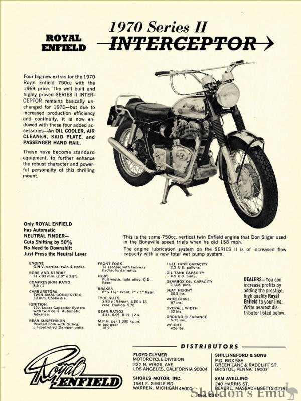 After the factory closed, a little over 200 Series II Interceptor engines were stranded at the dock in 1970, originally on their way to Floyd Clymer in the US, but unfortunately he had just died, and his export agents, Mitchell's of Birmingham, were left to dispose of them. They approached the Rickman brothers for a frame, and the Rickman brothers' main problem had always been engine supplies, so a limited run of Rickman Interceptors were promptly built.