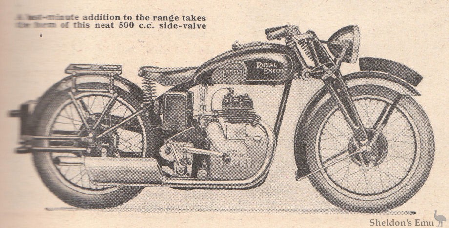 As a big-twin the 976 c.c. Enfield holds a truly honoured place. Its side-valve engine is notably smooth and effortless when heavily loaded with a sidecar, and the machine, although not unduly heavy, is capable of withstanding the roughest usage.