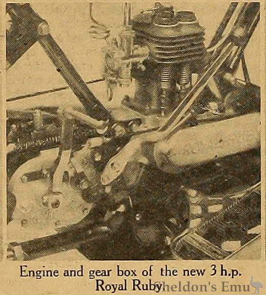 A countershaft two-speed gear (another Royal Ruby patent), with handle-bar control, clutch, and kick starter, follows well-tried lines. This is located behind the engine, and is carried on a bracket which forms one side of a triangle in the frame construction. Immediately behind the gear box is the pivoting point of the rear wheel fork, which is supported on a long bearing, below which are the pivoting ends of the stand.