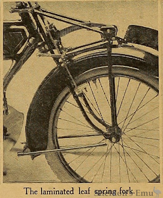The front fork is apparently very light in construction, the frame of which consists roughly of two triangulated members connected at three points with the wheel pin to make a fourth. The motion is that of the parallel link type, and the tension of the long laminated spring is adjustable.