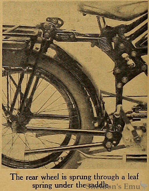 At its inner end the rear spring is carried on a saddle, which is fixed to the frame with two substantial bolts by means of a duplex structure formed of two steel pressings, which in turn are secured to the main framework by long bolts passing through lugs. At the upper end of this structure is a bearing supporting a duplex frame in which the spring is disposed. The outer end of this member contains the slides in which is the patented roller in the eye of the spring. Behind the bearing is linked an approximately vertical fork, which connects with the wheel fork near the wheel spindle.