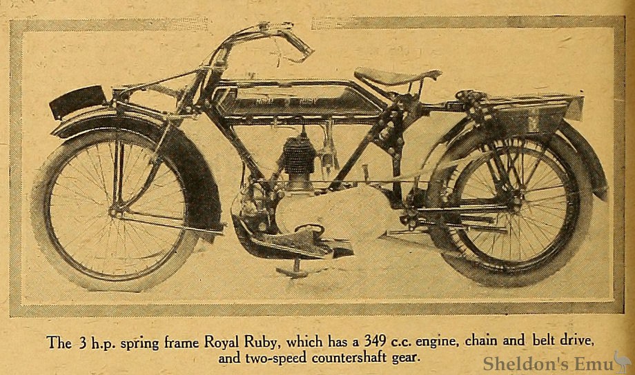 The 3 h.p. spring frame Royal Ruby, which has a 349 c.c. engine, chain and belt drive, and two-speed countershaft gear.