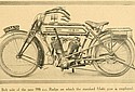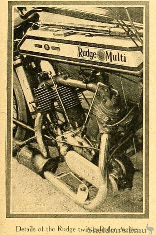 The new Rudge - we named it the "Rudge Multwin" in the absence of something better - has great promise. These who have been privileged to try it up to the present are quite enthusiastic in its praises. Right from the commencement the engine has given no trouble, despite the fact that it has been subjected to the most rigorous tests. For instance, in the first six days of its existence it had covered a thousand miles, mostly in connection with the "Rudge Mail Service," which consists of sidecar carriers running backwards and forward between the Rudge Works at Coventry and Birmingham with several hundredweight of goods. A change of drivers was provided, and the twin was kept at work from early morning till late at night. In addition, the machine has been taken over several severe trials courses in the Midlands, and up all the test hills on the Cotswold Range. Birdlip is no match for the outfit, and it has proved its ability to start from a stand still on this steep hill. The Old Wyche at Malvern has been scaled with ease on this powerful newcomer. With a 3¾ to 1 top gear, the new twin with sidecar attached will keep up a steady fifty miles an hour, and users assure us of the remarkable absence of vibration in the engine.