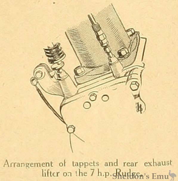 Despite the large capacity of the engine, viz., 998 c.c, the new Rudge twin gives no impression of clumsiness - indeed, the latest design is a very taking machine in appearance, its symmetry at once evoking favourable comment. As regards the bicycle portion of the machine, this follows Rudge practice in every particular, so that it is the engine only with which these notes deal. Single and twin Rudge engines are interchangeable in the standard design of frame, which is surely an attractive point. The multi-gear is of precisely the same design as on the 3½ h.p. model, and, of course, belt drive is used. What may seem curious on first thoughts is that belts last as long on the big twin as on the 3½ h.p. mount, but this is due to the more even pull of the twin as compared with the single.
