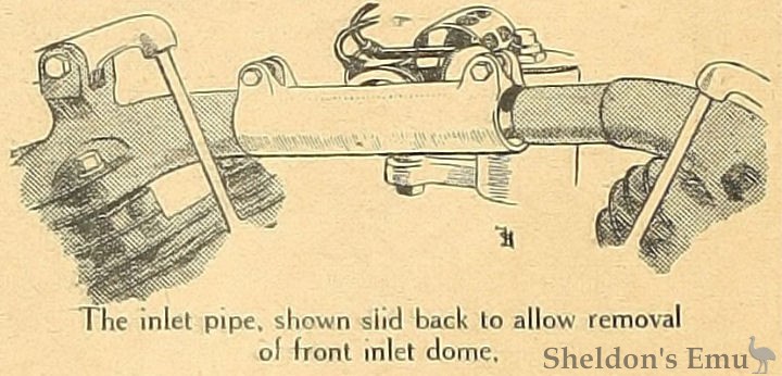 The valve lifters are very neatly arranged. Brackets are cast with the crank case to support the valve lifter wire, the wire casing for the rear cylinder being disposed underneath the projecting timing gear case. The inlet valve rockers are much bigger and sturdier than on the single-cylinder machine. The pistons are of the standard design, having flat tops and a piston ring top and bottom with diagonal slots, the walls of the pistons lying recessed at the sides. The valves are the same as those used on the 3½ h.p. machine.