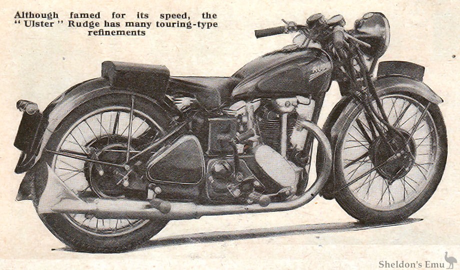 500 c.c. “Ulster” Model.—499 c.c. single-cyl. o.h.v. Rudge; dry-sump lubrication; magneto ignition; all-chain drive; oil-bath primary chain case; 4-speed gear with foot control; fuel, 3½ gals.; 27x3in. (front), 27x3.25in. (rear) tyres.