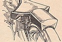 The four-speed gear box is hand-controlled, the gate being enclosed in the offside knee grip. A steel apron covers the end of the gear box and extends from the metal tool box to the rear of the timing chest. Two tool boxes are fitted, one on each side, between the rear chain stays.