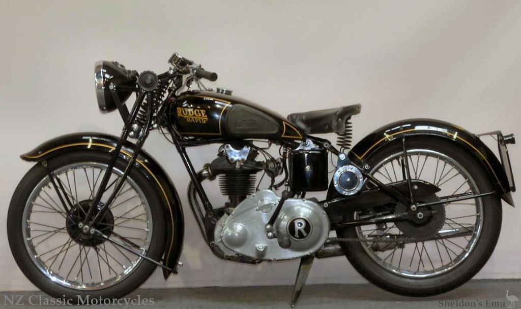 GEARBOX. -Rudge-Whitworth patent four-speed (Patent No. 331643). Gears In CONSTANT MESH, Kick starter mechanism ENCLOSED. Mechanism shield particularly neat and Instantly detachable. Positively operated foot change. Multi-plate clutch. Solo gear ratios: 6,39 to 1; 8,2 to 1; 11.2 to 1; 15.95 to 1.