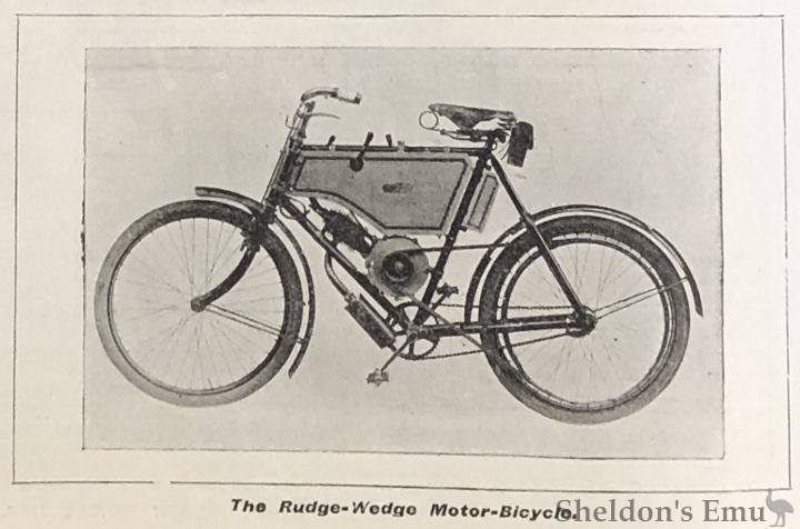 This machine is constructed by the old-established firm of Rudge-Wedge, Wolverhampton, whose cycles are well known for their high quality. As will be seen from the illustration, the motor-bicycle which they have just placed on the market is of a very symmetrical design. The motor, which can be had in two powers, either 1¾ or 2¼, is placed in an inclined position inside the frame, and is strongly supported between the diagonal and main tube. The drive is by means of a tubular section belt. The lubricator pump is conveniently placed alongside the steering socket, and either a spray or surface carburetter can be fitted at option. The accumulator, which has a capacity equal to 600 miles running, is carried in a metal case at rear of diagonal tube. A large silencer of cylindrical shape is fitted. A notable feature in the design of the motor is the position of sparking-plug, which is placed in the centre of combustion head. The controlling levers are conveniently placed. All the bicycle parts are of special strength, and a rim brake is fitted to front wheel, a New Departure or Morrow Coaster hub being built into the back wheel. The tyres used are Dunlop-Bartlett special motorcycle grade. The petrol tank has capacity for 140 miles running. The price of the 1¾ h.p. machine is £40, and of the 2¾ h.p., £42 net.
